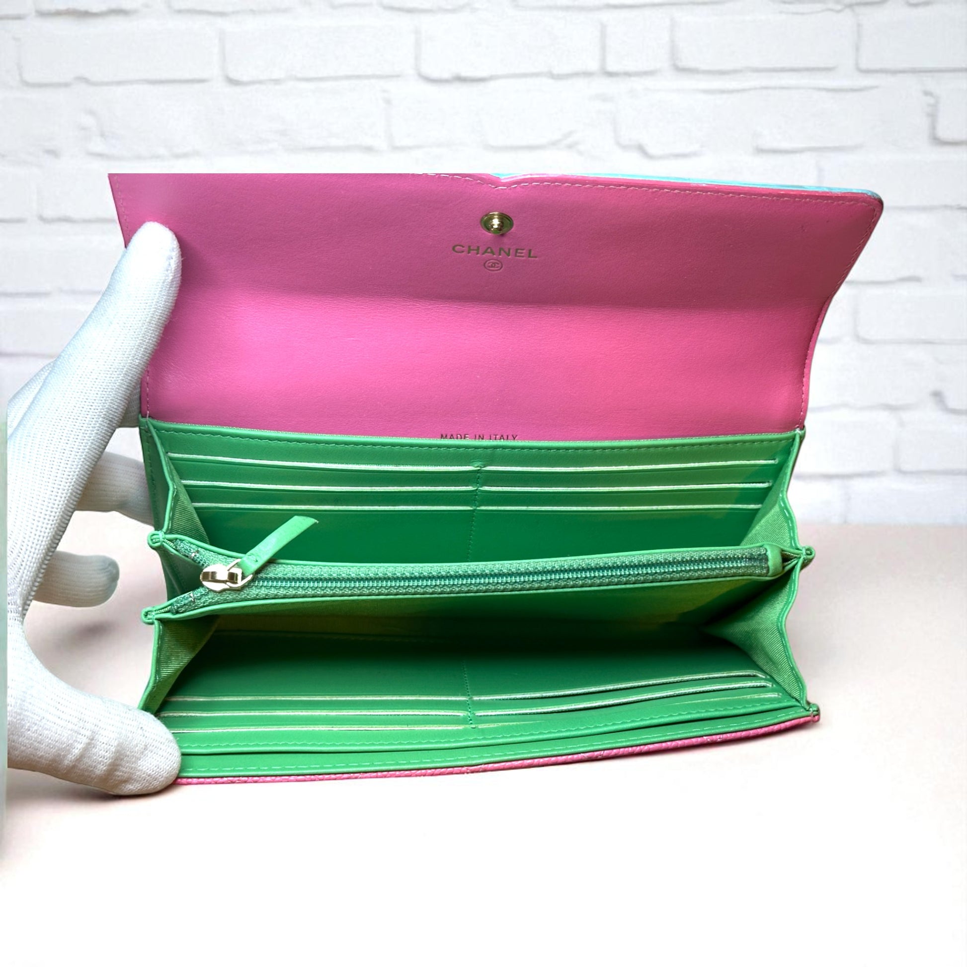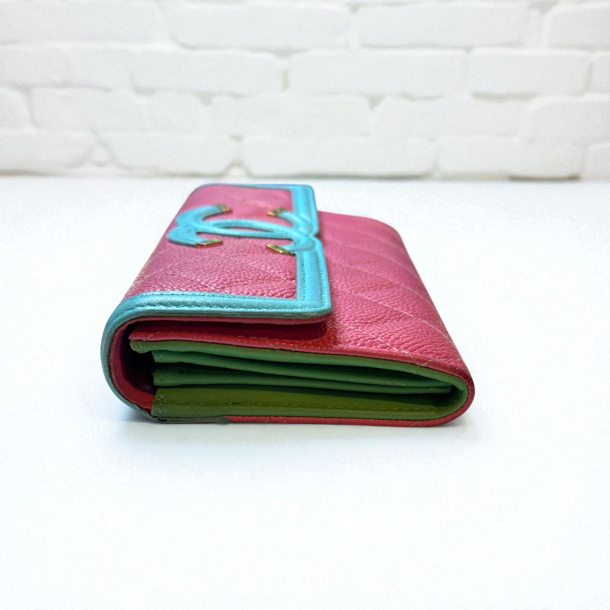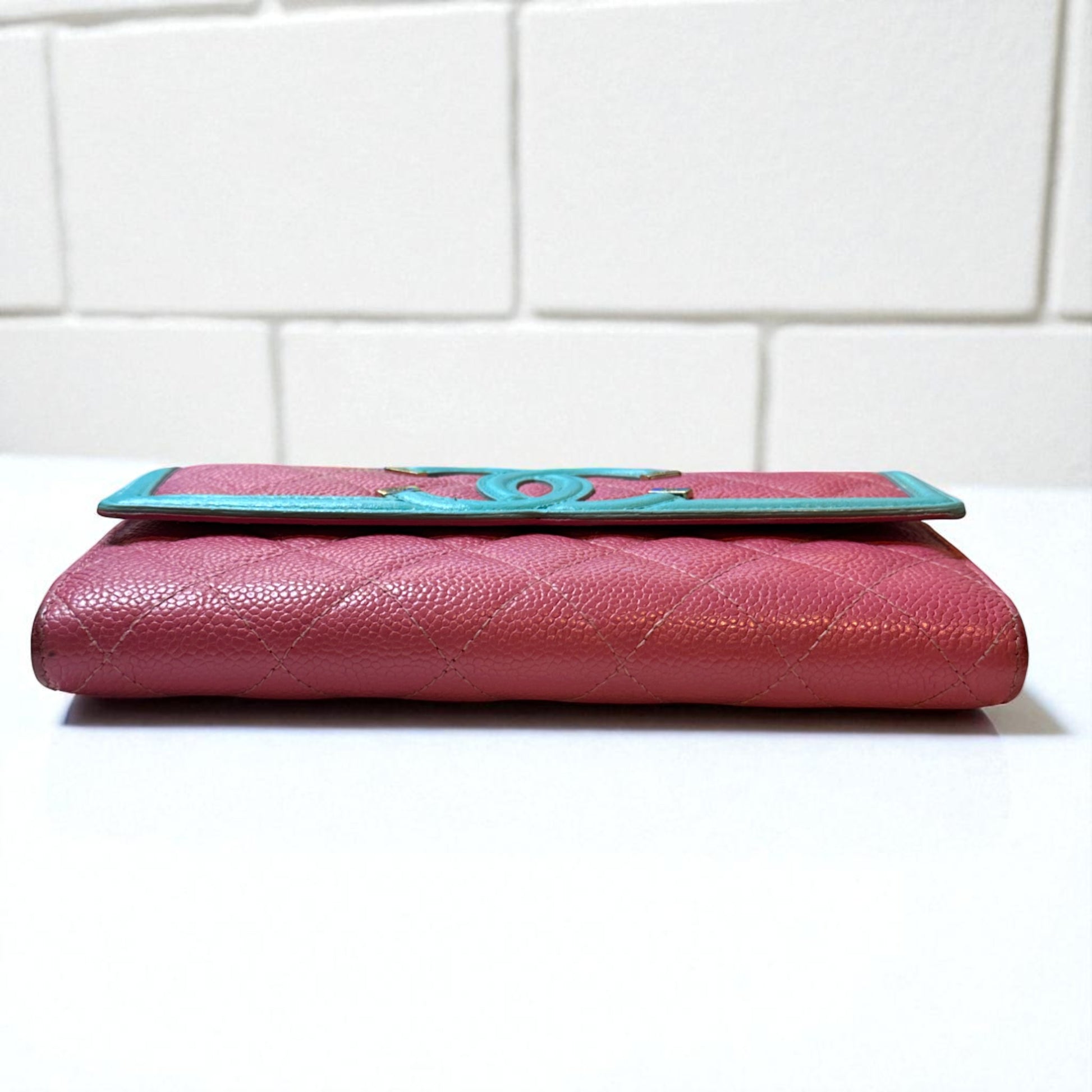 Exterior - Quilted caviar leather - vibrant pink with tiffany blue trim, gold tone brass hardware, button snap closure